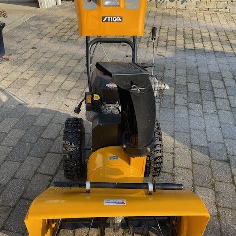 Stiga Snow Flake sneslynge i gul farve. Benzindrevet maskine med kraftig motor og hjultræk. Udkastertud kan justeres til siden for at styre retningen på sneen. Egnet til rydning af indkørsler, gårdspladser og mindre veje. Maskinen har håndtag med betjeningsgreb til fremdrift og sneindtag samt elstart via 230 volt tilslutning ifølge mærkat på motoren.
