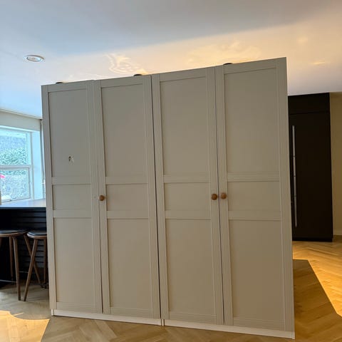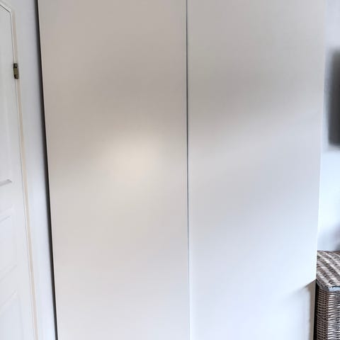 2 stk pax klædeskabe fra ikea. De har brugsspor, de gerne billeder, der er også et afslag i toppen på den ene men på bagsiden. Men er fint funktionelt.