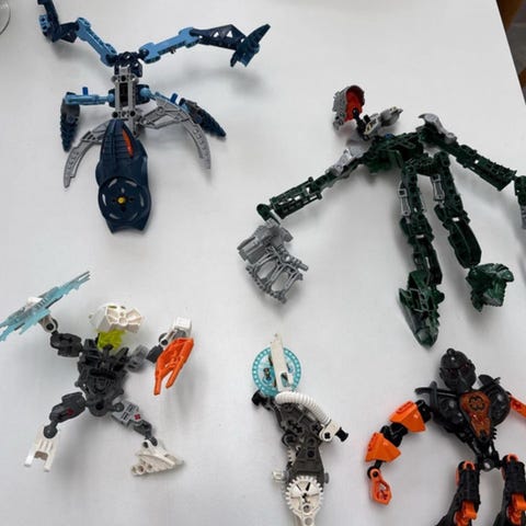 LEGO Bionicle figurer. Sættet består af flere samlede Bionicle-figurer i forskellige størrelser og farver, herunder større krigerfigurer og mindre figurer. Delene er typiske Bionicle-elementer med bevægelige led, masker og våben. Velegnet som samlerobjekt, til leg eller som reservedele til andre LEGO Bionicle sæt. Der er hvad der kan ses på billederne.