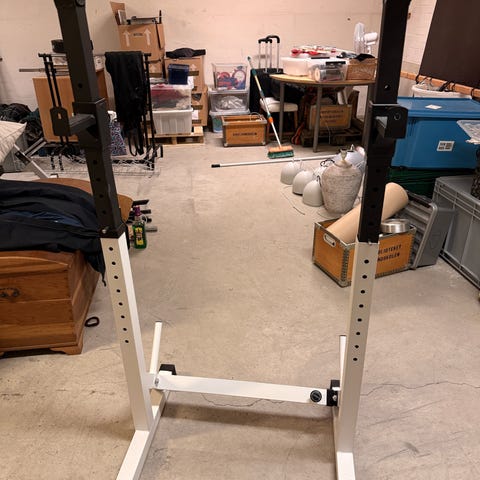 Næsten ubrugt squat rack til hjemmetræning. Justerbar højde, plads til vægtstænger og vægtskiver. Stabil og robust. Ikke helt samlet – nemt at samle.