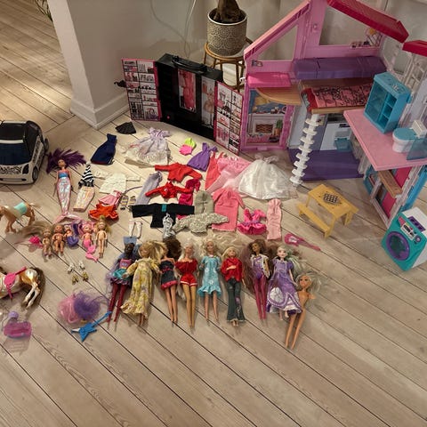 Barbie dukker og tilbehør sæt. Sættet indeholder flere Barbie dukker samt forskellige køretøjer, blandt andet biler og en større bil/vogn. Derudover medfølger forskelligt tilbehør som hest, cykel, møbler, legehus og en del tøj og småting til dukkerne. Sammenklappeligt hus (se sidste billede) kan medfølge gratis hvis du ønsker det. Huset trænger til en klud og der er knækket lidt hist og pist, men kan sagtens bruges til masser af leg endnu. Vær dog opmærksom på at huset ikke kan sendes, da den ikke kan være i kassen.