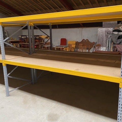 Flotte Bosal stålreoler. 50 stk. galvaniserede stålhylder B 98 cm D 60 cm. 11 blålakerede gavle H 230 cm D 60 cm. 5 cm hyldebærerinterval. inklusive hyldebærer m.m.