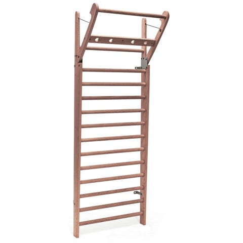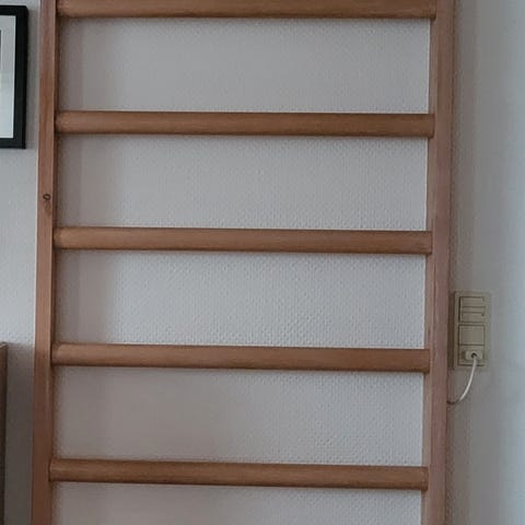 Ribbevæg i træ med lodrette sidestykker og tværgående ribber. Monteres på væg og kan anvendes til træning, udstrækning og forskellige gymnastikøvelser i hjemmet eller i et træningsrum eller et børneværelse. Konstruktionen fremstår i massivt træ med runde ribber, egnet til både børn og voksne afhængigt af montering og belastningsevne.