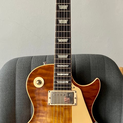 Gibson Les Paul Heritage Series 80 fra 1980. Den er med Tim Shaw pickupper. Bagsiden er med synlige brugsspor i lakken. Leveres i formstøbt hardcase med plysfor.