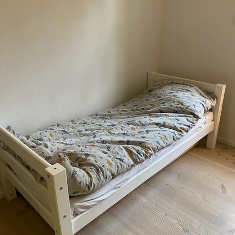 Halvhøj seng fra Spiloppe med hjemmelavet underkøje. Halvhøj seng som kan bruges som halvhøj seng med opbevaringsplads nedenunder, eller som køjeseng som vi har gjort. Vi har lavet en sengeramme med lameller og madras som passer under sengen, så man får en køjeseng, hvor selv helt små børn kan sove. Vi har også en ikea påsætning sengehest, som kan tilkøbes for 50kr. hvis det ønskes. Sengen er i god stand og er kun samlet én gang. Der er dog brugsspor på trappen og lidt klistermærker som ikke er fjernet. Ellers meget flot i træet og vi har været glade for vores lave køjeseng. Sengen er umiddelbart identisk med den fra Hoppekids. 160 x 70 m.