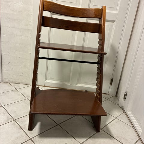 Stokke Tripp Trapp højstol i sort. Klassisk træhøjstol med justerbar siddeplade og fodplade, som kan tilpasses barnets højde. Designet til at kunne bruges i mange år ved spisebordet ved at regulere pladernes position efter behov.