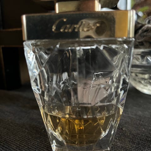 Cartier parfume i glasflakon med gylden væske. Flakonen har facet-slebet design og lys guldfarvet top med indgraveret Cartier-logo. Egnet som duft til personlig brug eller som supplement til en parfumesamling. Størrelse 100 ml.