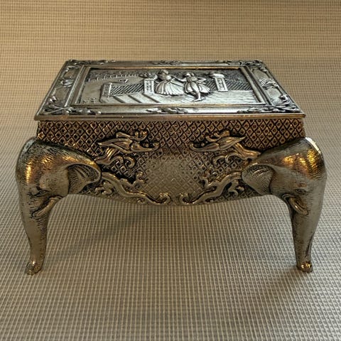 Smykkeskrinet er i forgyldt bronze med flot motiv på låget og mønster hele vejen rundt på æsken. Er et samlerobjekt.