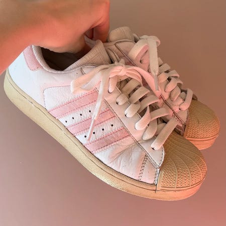 Den klassiske blå Adidas m hvide striber. Nye snørebånd. Brugte, men stadig rigtig fine