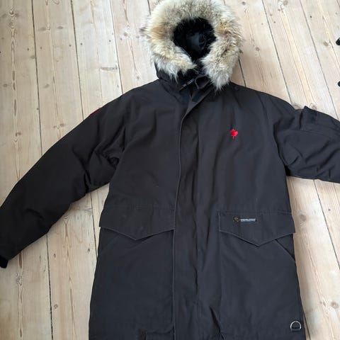 Klassisk Canada Goose parka af modellen Arctic Tech (Style 6520, light grey) med aftagelig coyote-pelskant og frontlommer samt stiklommer. Uovertruffen kvalitet. Har en del brugsmærker efter et par skiture, men den vil være som ny efter en rens.