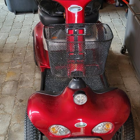 El-scooter med 4 hjul i rød farve. Modellen har sort sæde med armlæn og nakkestøtte samt kurv foran til opbevaring. Scooteren er udstyret med spejle og lys, og den brede fodplade giver god plads til fødderne. Velegnet som hjælpemiddel til persontransport på fortov og jævne underlag.