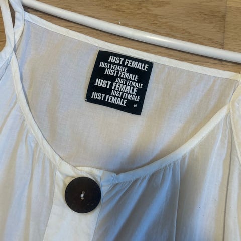 Just Female Falkon sommerkjole i grøn bomuld i størrelse M. Kjolen har tynde stropper og store knapper foran. Der er elastik i siderne for bedre pasform. Materialet er 100 % bomuld, som kan maskinvaskes ved 30 grader og stryges varmt. Velegnet som let sommerkjole til hverdag eller ferie.
