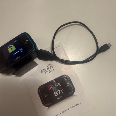 Saphe Drive Pro trafikalarm i sort. Enheden monteres i bilen og har display på fronten med betjeningsknapper i siderne. Leveres med holder til montering. Understøtter Bluetooth-forbindelse til smartphone for visning af trafik- og alarminformationer under kørsel. Egnet til brug i personbil eller varebil.