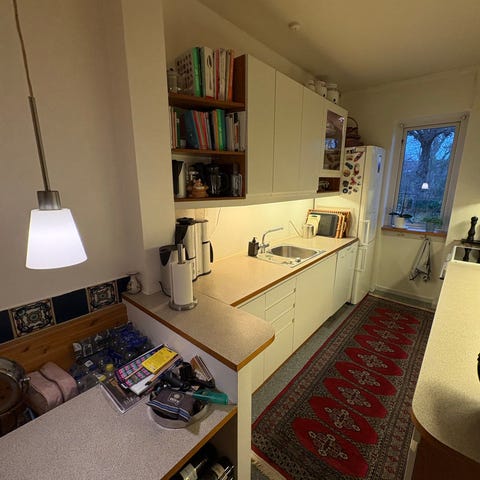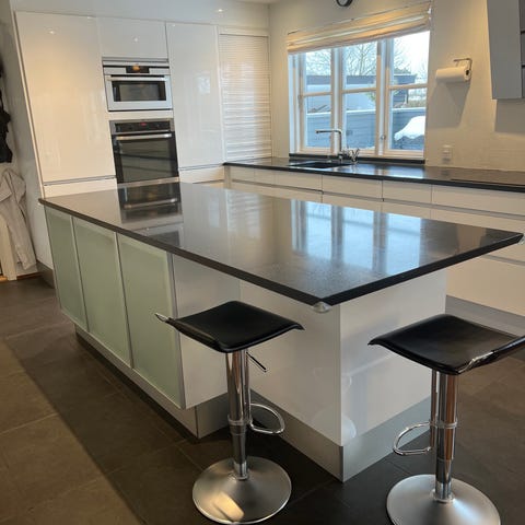 Hvidt vinkelkøkken med hvide højglansskabe og sorte bordplader. Køkkenet er indrettet i vinkel med overskabe og underskabe, integreret kogeplade, indbygningsovn, opvaskemaskine og køle-/fryseskab i stål-look. Der er sort laminatbordplade og lys trægulv. Flisebeklædt væg ved kogeplade og arbejdsområde. Køkkenet egner sig til montering i tilsvarende rumindretning eller til tilpasning i anden bolig. Eventuelle hvidevarer, armatur og pynt følger kun med, hvis det er aftalt særskilt. - Skal afhentes og nedtages på adressen første uge i marts af køber. hele køkkenet medfølger