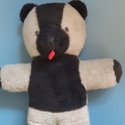 Plysdukke med lilla krop, lys bug og store hænder og fødder. Dukken har rødt garnhår, blå næse og mund med synlig tunge. Velegnet som krammedyr eller legefigur for børn. Fremstillet i blødt plysstof.