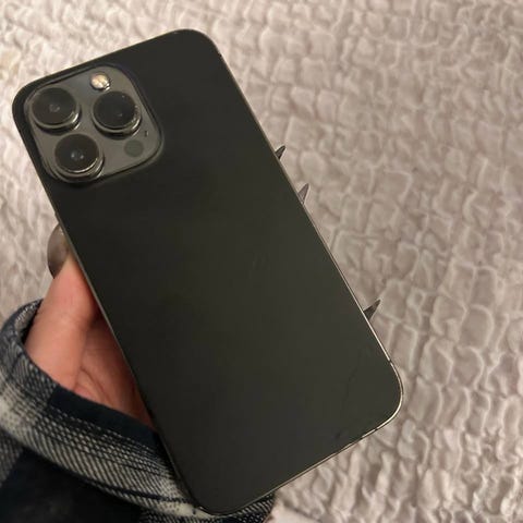 Apple iPhone 13 Pro smartphone med 128 GB intern hukommelse. Enheden har skærm med frontkamera og bagside med tredobbelt kameraopsætning. Farven fremstår som en mørk/sort nuance. På billederne ses en revne/skade på bagsiden nær kanten. Velegnet som smartphone til daglig brug med lagringsplads til apps, billeder og video. Oplader, og tilbehør haves ikke.