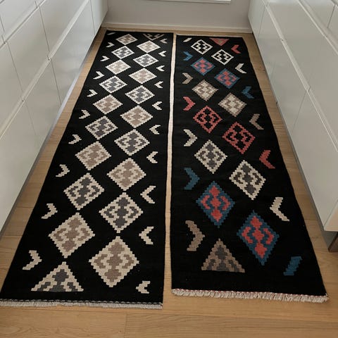 Tæppe løber i uld med stribet mønster i flere farver, herunder rød, sort, grå og orange. Tæppet har vævet, fladt design med geometriske detaljer fordelt over hele overfladen. Egnet som gangløber eller til brug i smalle rum som entré eller gang. Materialet fremstår som tyndt og fleksibelt, hvilket gør det nemt at rulle sammen og flytte rundt efter behov.