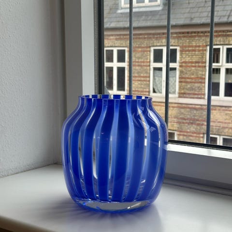 Hay glasvase i lyserødt glas med geometrisk rillet mønster.
