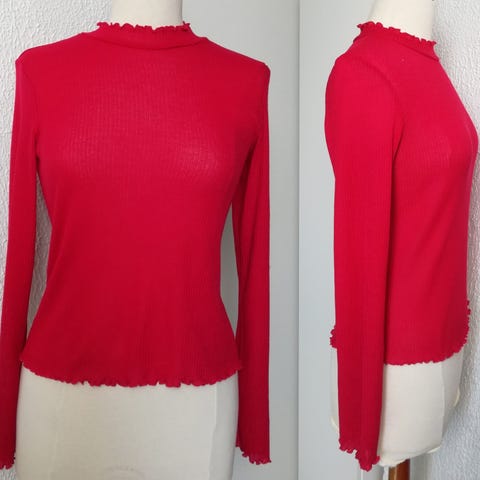 Sexy H&M bluse med choker . Blusen er rød og ribstrikket med kortærmer. Foran har den dyb V-udskæring med påsyet halsbåndseffekt, og bagpå er der stor rund udskæring. Velegnet som overdel til hverdag eller brug i kombination med nederdel eller bukser.