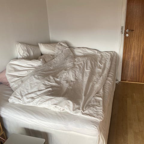 IKEA seng med lamelbund og polstret sengegavl. Sengen består af en ramme med trælameller samt en høj, polstret gavl i lys farve. Lamelbunden giver støtte til madrassen og kan bruges med forskellige typer madrasser. Velegnet som dobbeltseng afhængigt af mål på ramme og madrasser, som ikke fremgår nærmere af oplysningerne. Sengen kan anvendes i soveværelse eller gæsteværelse som almindelig soveløsning.