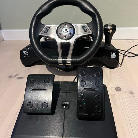 PlayStation rat og pedalsæt til gaming. Sættet består af et rat med PlayStation-knapper og et pedalsæt med gas- og bremsepedal, monteret på en base. Enheden tilsluttes med kabel og er egnet til bilspil og racersimulationer på kompatible PlayStation-konsoller eller pc, afhængigt af model og drivere. Velegnet til brug på bord eller stativ, hvor pedalenheden placeres på gulvet foran brugeren.