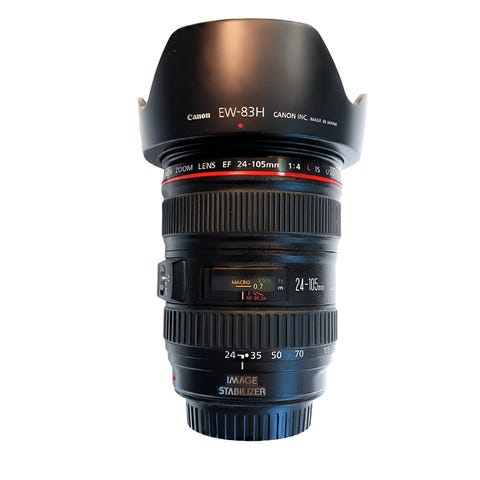 Canon EF 24-105mm f/4 L IS USM zoomobjektiv i sort.
