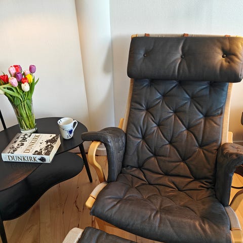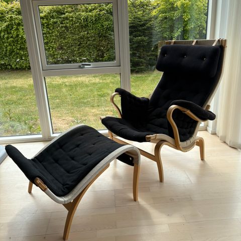 Bruno Mathsson lænestol med skammel sort læder træstel