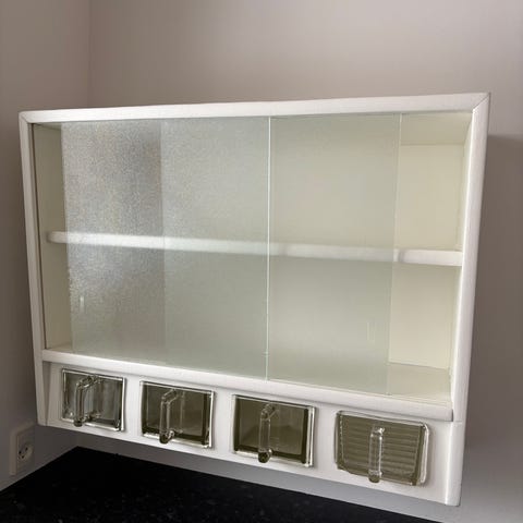 Helt originalt københavnerskab med glasruder og 6 glasskuffer. Det er malet hvidt!
