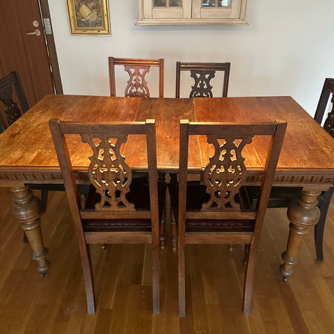 Lidt afskalning på den ene stol og bordhjørne.