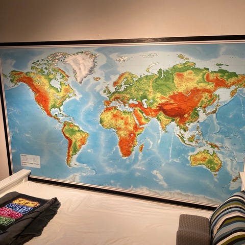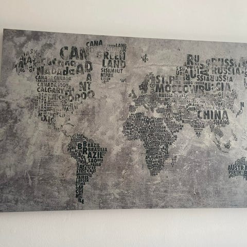 Verdenskort vægdekoration med ramme. Kortet viser verdens lande og kontinenter i farver på blå baggrund. Det er monteret i en lys rektangulær ramme og egner sig som vægdekoration i stue, kontor, børneværelse eller andre rum, hvor man ønsker et oversigtskort over verden som dekoration.