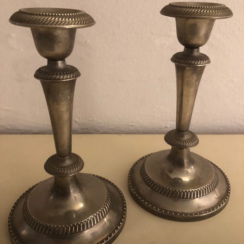 Lysestager i tin af mand og kvinde - Gerotin.H 10 cm, Dia 2,8 cm.Sælges som sæt, begge velholdte. Gå til varen, for flere billeder.
