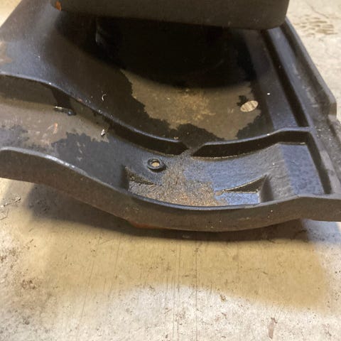 Udluftnings hætte teglsten, mat sort. Mål: 28x45,5cm. Består af 2 dele, en tagsten med rør gennemføring Ø100mm, og en "hat" til at lægge oven på. Denne sten har en lille skade, idet hatten mangler et "ben" (se billede).