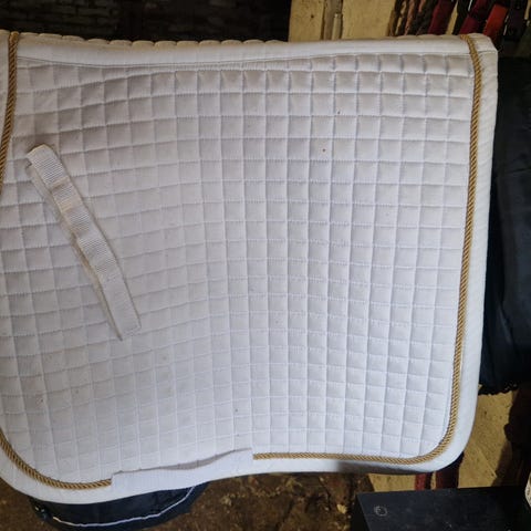 Pænt hvidt underlag. Ingen huller eller slitage i hverken over, under eller kant. Lidt synlig farve fra gjord og sadel.