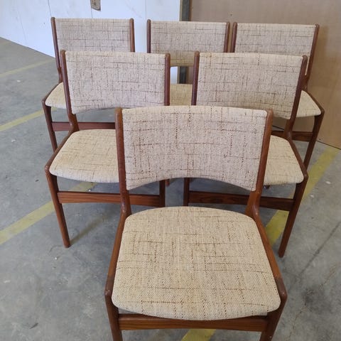 Sæt på seks spisebordsstole i teaktræ fra 60’erne. Som ofte tilskrives Erik Buch.