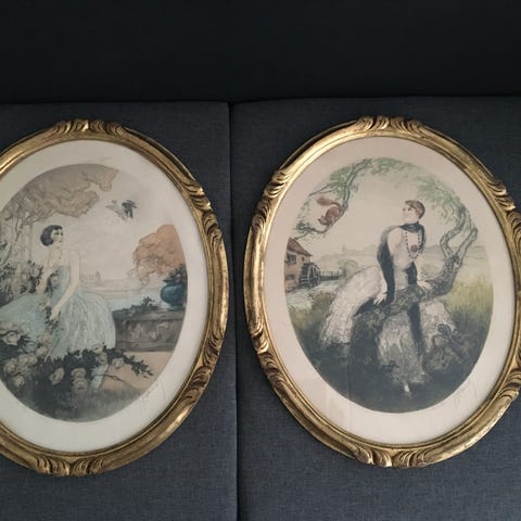 2 Litografi på papir af Jean Hardy (f.1880) Frankrig, i smukke udskåret guld rammer 1930 år gl. Motiv Ung kvinde. Smuk oval guldramme med udskæringer. Fra 1930'erne. Signeret i blyant. I flot stand.