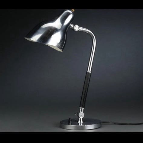 Model har en messingfatning og opalglasskærm, der giver et blødt, diffust lys. Arkitekt Vilhelm Lauritzen (1894-1984) skabte disse lamper i 1930'erne til Radiohuset i København. Oprindeligt brugt til at signalere studieaktivitet med farvet lys, var det en del af Lauritzens holistiske tilgang til arkitektur, hvor han også designede bygningens interiør og belysning i samarbejde med Louis Poulsen.