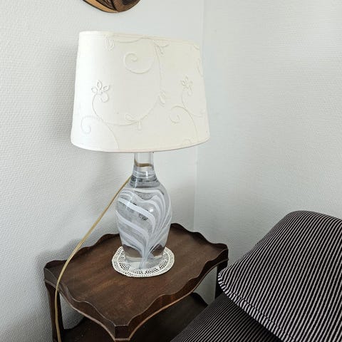 Super smuk Murano bordlampe i blåt glas med bobler og en grå råsilkeskærm. Virker og er så fin.