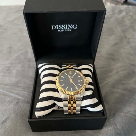Dissing armbåndsur til kvinde. Uret har en tofarvet metalrem i guld og sølv samt en lys urskive med markeringer og datovisning. Leveres i original Dissing-æske som vist på billederne. Velegnet som hverdagsur eller til pænere brug.