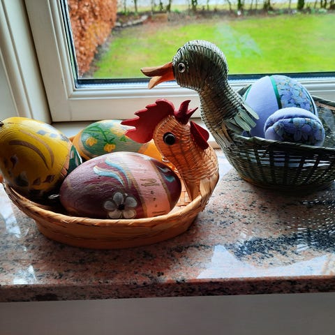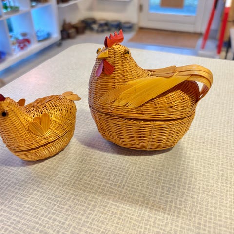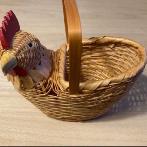 påskedekoration bestående af en fletkurv formet som en høne samt flere små høns. Kurven er i flettet materiale med hank og pyntet med bånd. De små høns er i hvidt materiale med røde detaljer. Egnet som bordpynt eller dekoration til påske, eller æggevarmer.