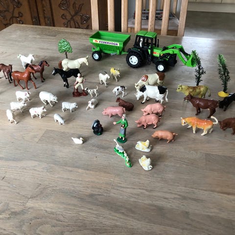Legetøj bondegårdssæt med traktor, vogn og forskellige bondegårdsdyr. Sættet indeholder blandt andet traktor med anhænger samt flere figurer af dyr og mennesker. Egnet til leg med bondegårdstema og rolleleg på bord eller gulv.