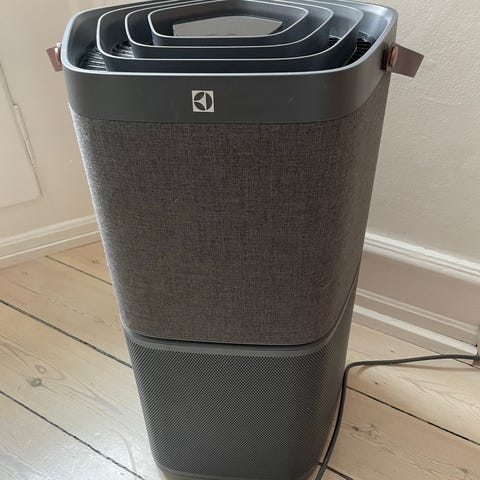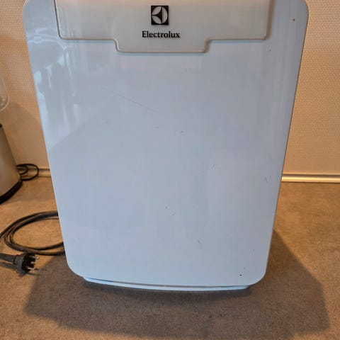 Electrolux luftrenser i grå farve. Cylindrisk model med luftindtag hele vejen rundt og udblæsning i toppen. Enheden har betjeningspanel på toppen og medfølgende strømforsyning. Velegnet til brug i opholdsrum som stue eller soveværelse, hvor der ønskes filtrering af indeluften. Nypris ca. 1400 kr,-