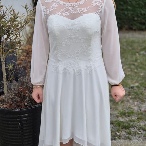 Flot og enkel råhvid Konfirmationskjole til den slanke pige. Kjolen har en fin overgang fra blonde til skørt. Brugt en gang og fremstår som ny. Er fra ikke ryger hjem. Købt hos Lykkebrudekjoler.