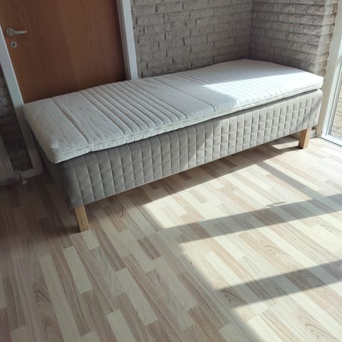 IKEA Sultan seng med madras i grå farve. Sengen fremstår som en enkel enkeltseng med polstret ramme og træben. Madrassen er integreret i sengerammen, og der medfølger en hvid topmadras, som ses på billederne. Velegnet som enkeltseng til soveværelse, gæsteværelse eller børneværelse. Kan leveres til dørtrin mod merpris.