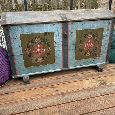 dragkiste, antik kiste, håndmalet kiste, antik møbel, vintage kiste, 1791 kiste, gammel opbevaringskiste, opbevaring, patineret kiste, bondekiste, malet dragkiste, antikt møbel, opbevaringsmøbel, håndlavet