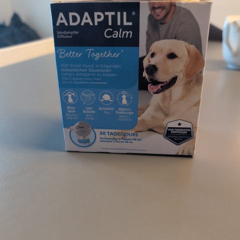Adaptil Calm Home Diffusor til hund. Sættet består af en elektrisk diffuser til stikkontakt og en flaske med Adaptil Calm opløsning. Produktet er beregnet til indendørs brug og anvendes til hunde. Diffusoren tilsluttes en almindelig stikkontakt, hvor væsken langsomt frigives i rummet over en periode angivet på emballagen. Velegnet til brug i hjemmet, f.eks. i opholdsrum, hvor hunden opholder sig mest. Leveres i original æske med diffuser og flaske med væske som vist på billederne. Aldrig brugt