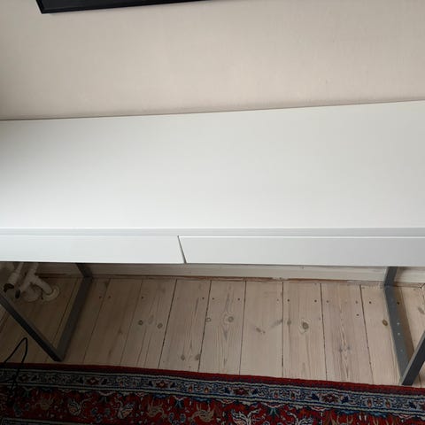 Stilrent og minimalistisk bord i hvid finish med slanke ben og praktisk kabelhul i bordpladen. Perfekt som skrivebord, arbejdsstation, sminkebord eller konsolbord i entré eller kontor.