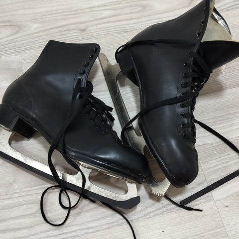 Kunstskøjter i sort farve i størrelse 42/43. Klassisk støvlemodel med høj skaft og snørelukning, der giver støtte omkring anklen. Skøjterne har metalblade med takker foran, velegnet til kunstskøjteløb og generel skøjtning på is.
