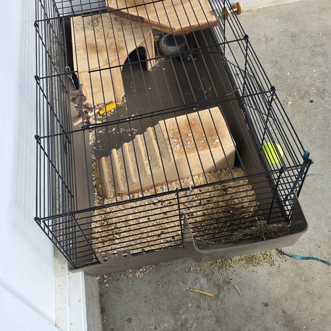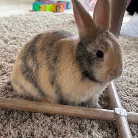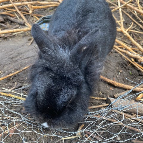 Grå kanin. Kaninen har tæt pels og lange ører og befinder sig i et bur med trådnet. Egnet som kæledyr eller til avl, afhængigt af købers behov. Yderligere oplysninger om alder, køn og race bør indhentes hos sælger. Bur er med