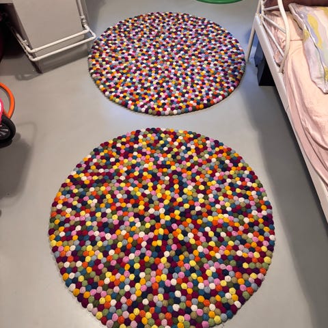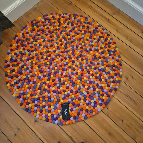 Hay rundt tæppe i flerfarvet design. Tæppet består af små uldkugler, der danner et tæt og dekorativt mønster. Velegnet som blødt og farverigt gulvtæppe i stue, børneværelse eller andre opholdsrum. Materialet er uld, som giver en varm og behagelig overflade at gå på.