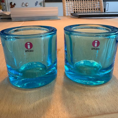 Iittala kivi i glas. To klare glasstager, med kraftig, massiv glasbund og Iittala-logo på siden. Velegnet til fyrfadslys og små stearinlys og kan bruges enkeltvis eller samlet som dekoration på bord eller vindueskarm.